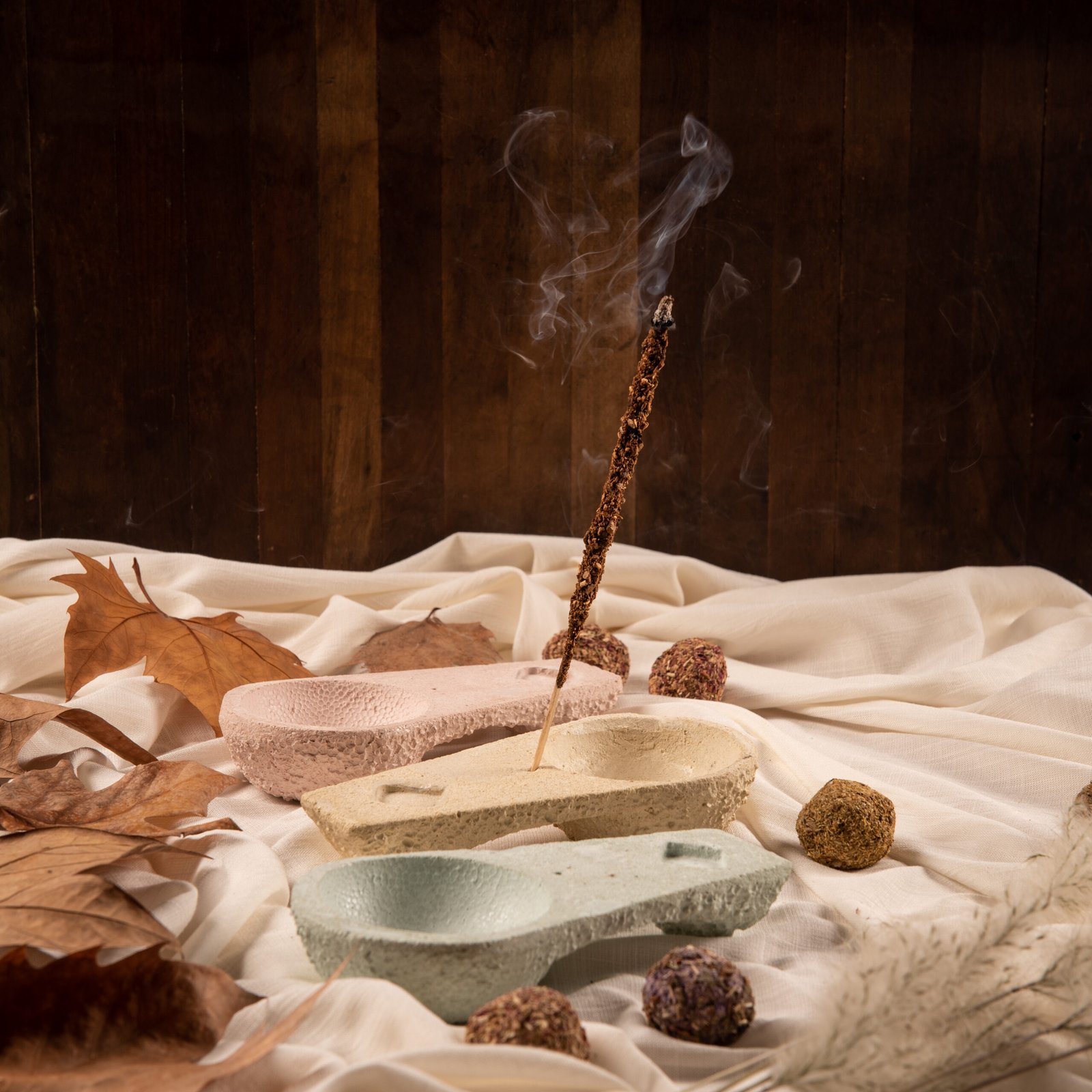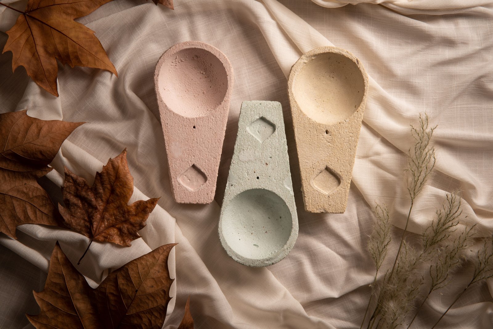 En tres colores disponible, de cemento coloreado, hechos a mano. Ideal tanto para varillas, como para bombillas o pirámides.